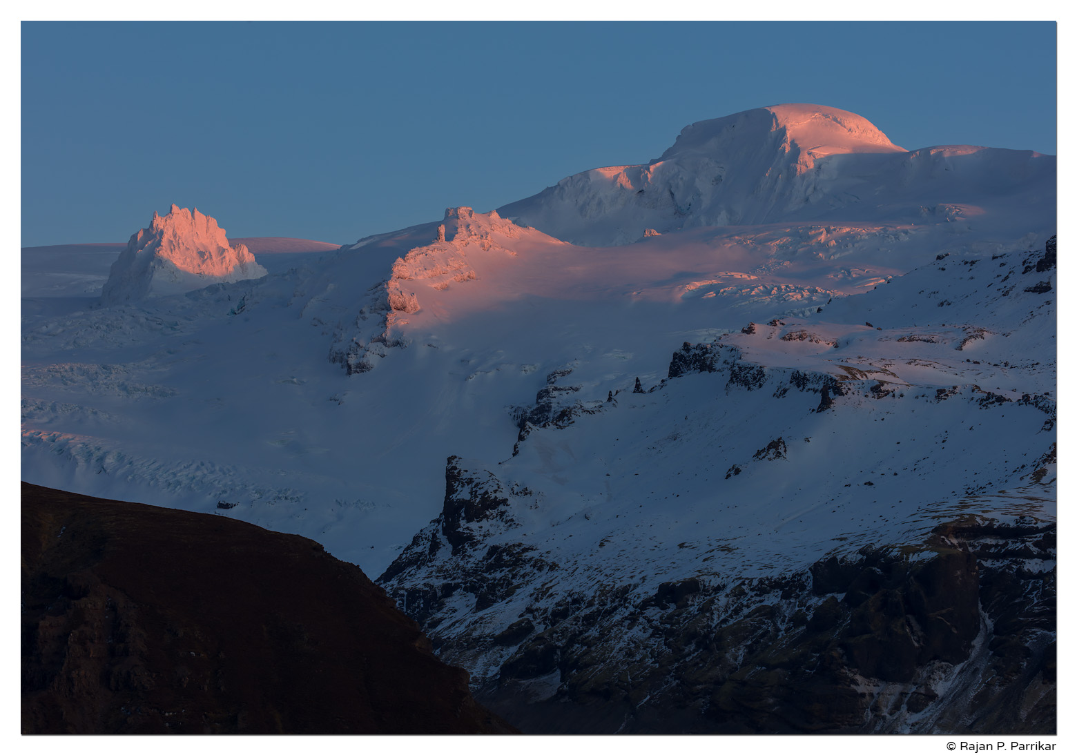 Late-evening winter sun on glacier and summit. Hvannadalshnjúkur in both frames; Svínafellsjökull in the foreground of one.