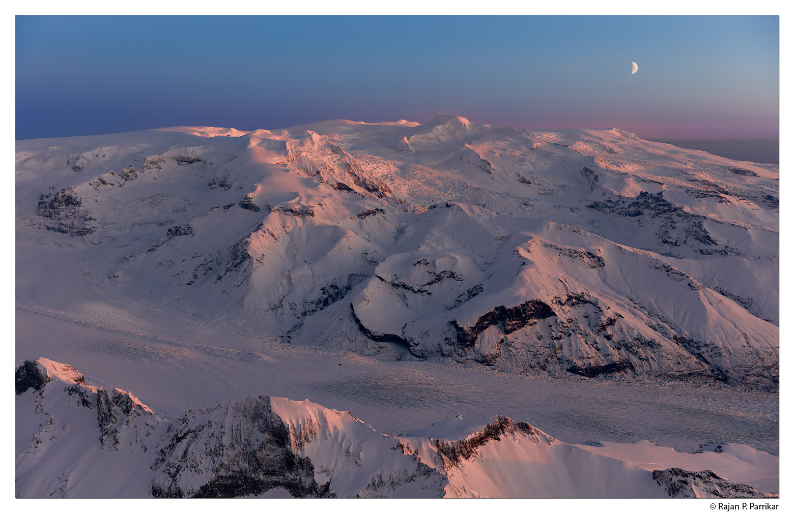 Late-evening winter sun on glacier and summit. Hvannadalshnjúkur in both frames; Svínafellsjökull in the foreground of one.